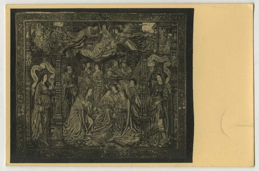 Cartolina postale fotografica di misura 136x89 mm con griglia al verso. Condizioni : USATO - Stato : Buono, ordinari segni d'uso e del tempo. Altre note : La fotografia raffigura il primo arazzo fiammingo della "Passione di Cristo" creato da Van Aelst che tratta della nascita di Cristo. La prima figura in primo piano a sinistra è Sibilla Ellespontica, l'ultima a destra è Sibilla Libica.