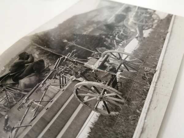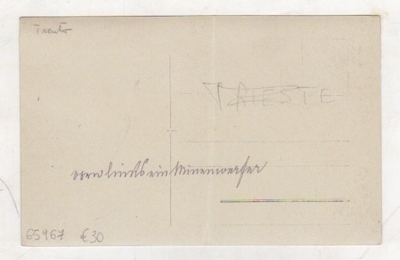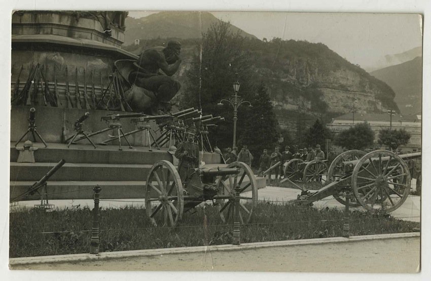 Cartolina postale fotografica di misura 139x89 mm con griglia al verso. Condizioni : USATO - Stato : Ordinari segni d'uso e del tempo, piegatura lungo l'immagine. Altre note : La fotografia raffigura il monumento a Dante ricoperto e circondato dalle armi prese agli italiani durante la prima guerra mondiale. Accanto alle armi alcuni uomini in divisa. Al verso note manoscritte.