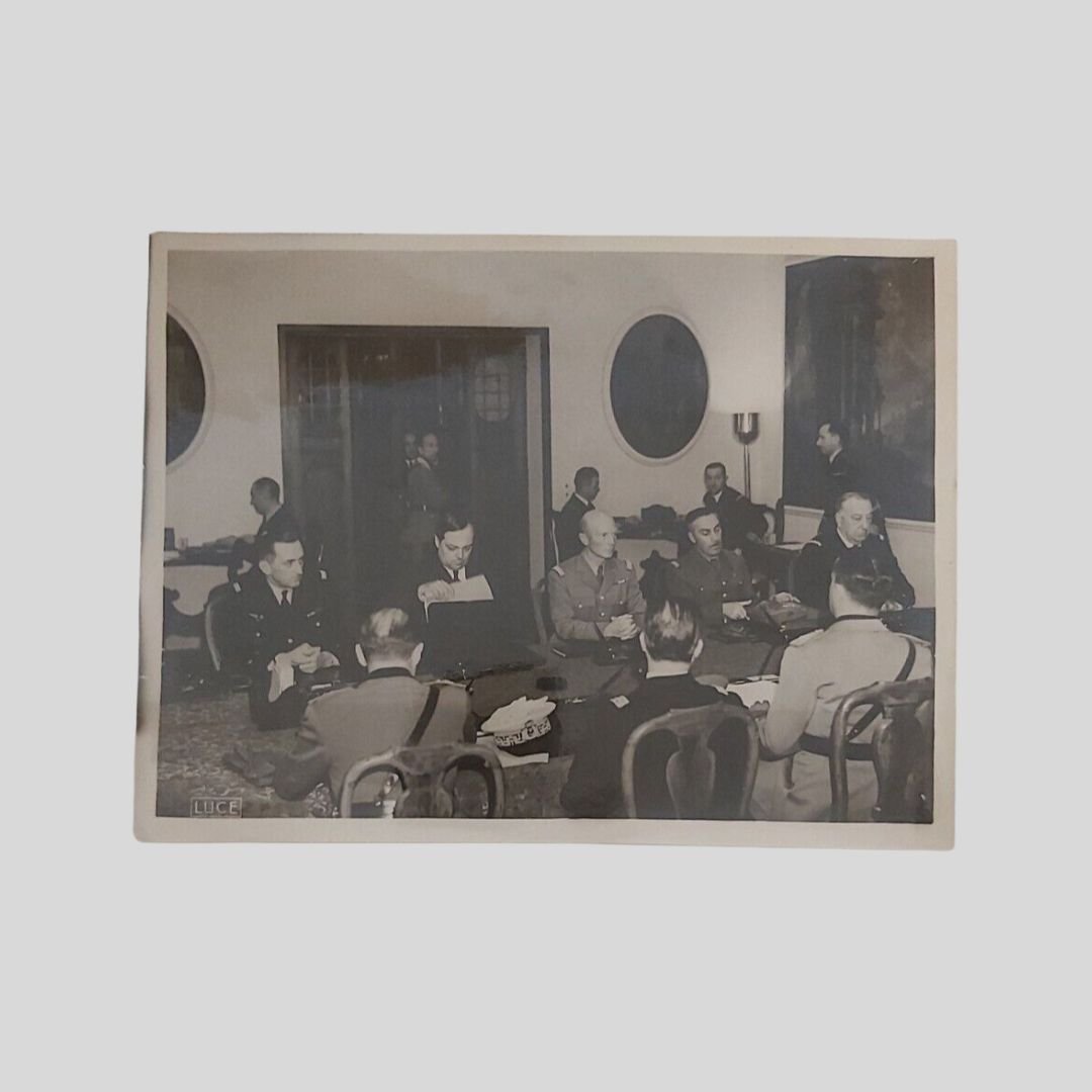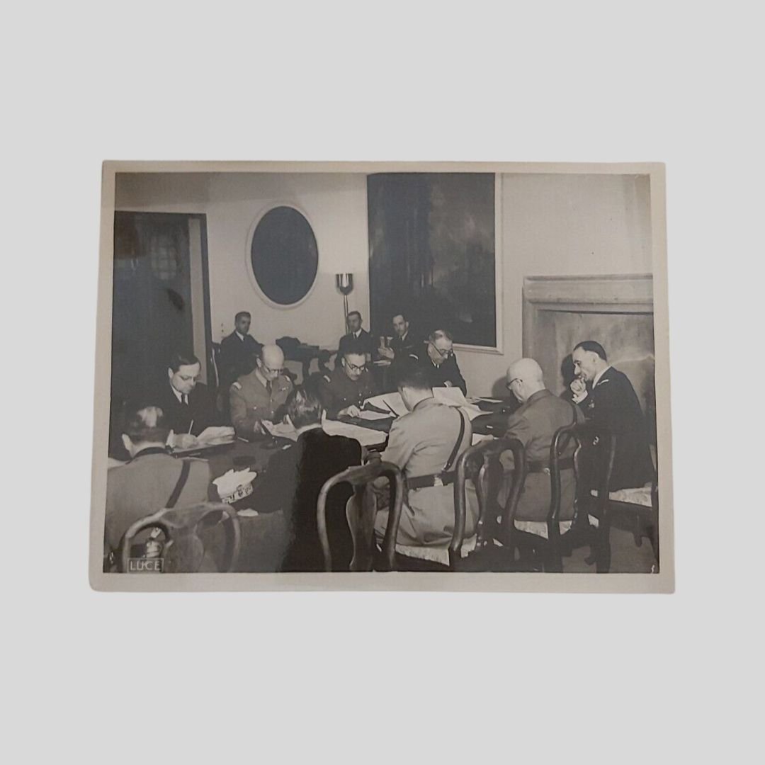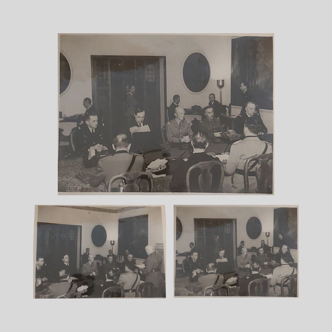 Roma, Villa Incisa, 3 fotografie di grande formato (mm 240×180), Istituto Naz. Luce. Sono presenti, tra gli altri, il Ministro degli Esteri Galeazzo Ciano, il Maresciallo Badoglio, l’Ambasciatore Noel, i Generali Huntzinger, Parisot, Bergeret, Roatta, Pricolo, il Vice Ammiraglio Leluc, l’Ammiraglio Cavagnari. In buone condizioni. Rare.
