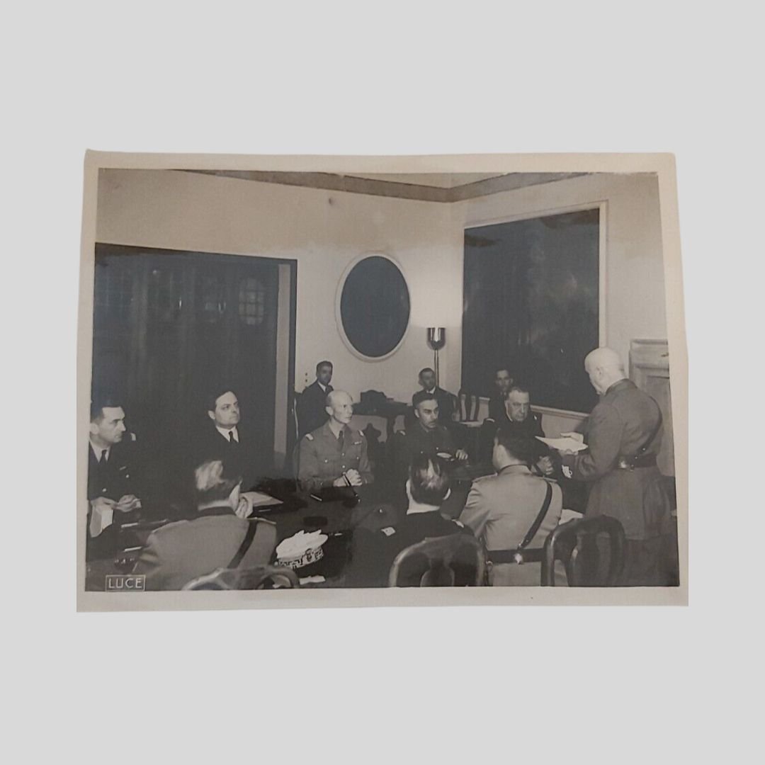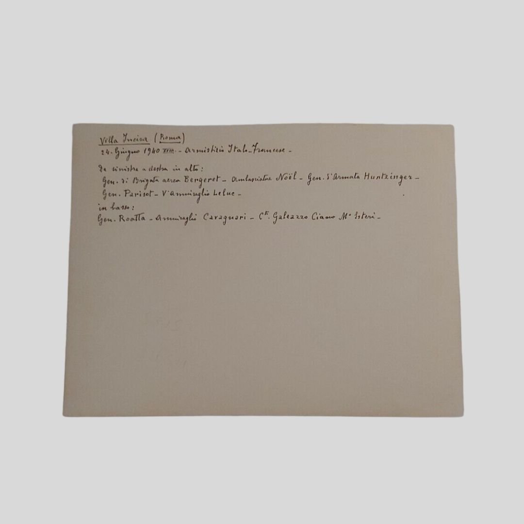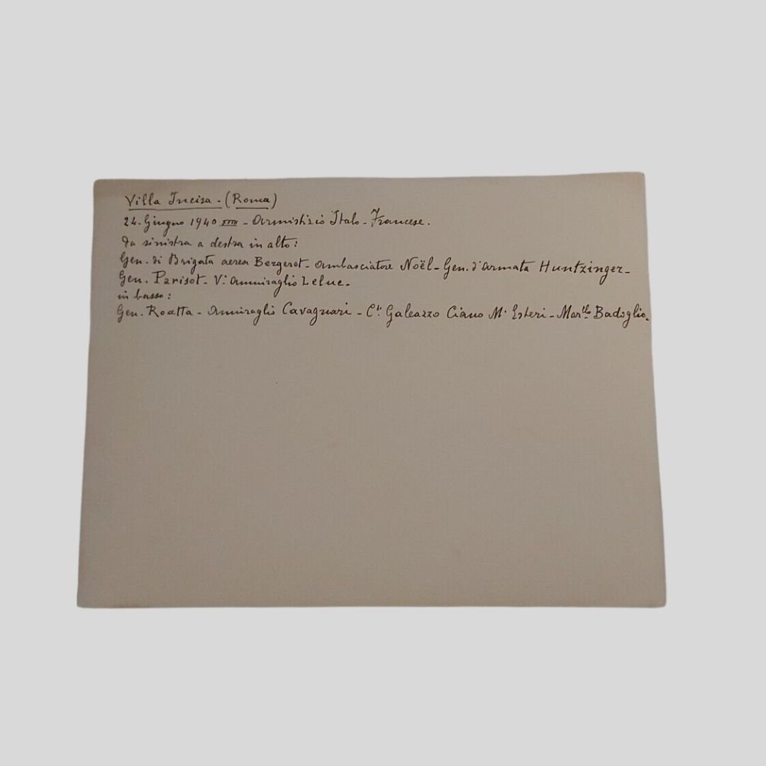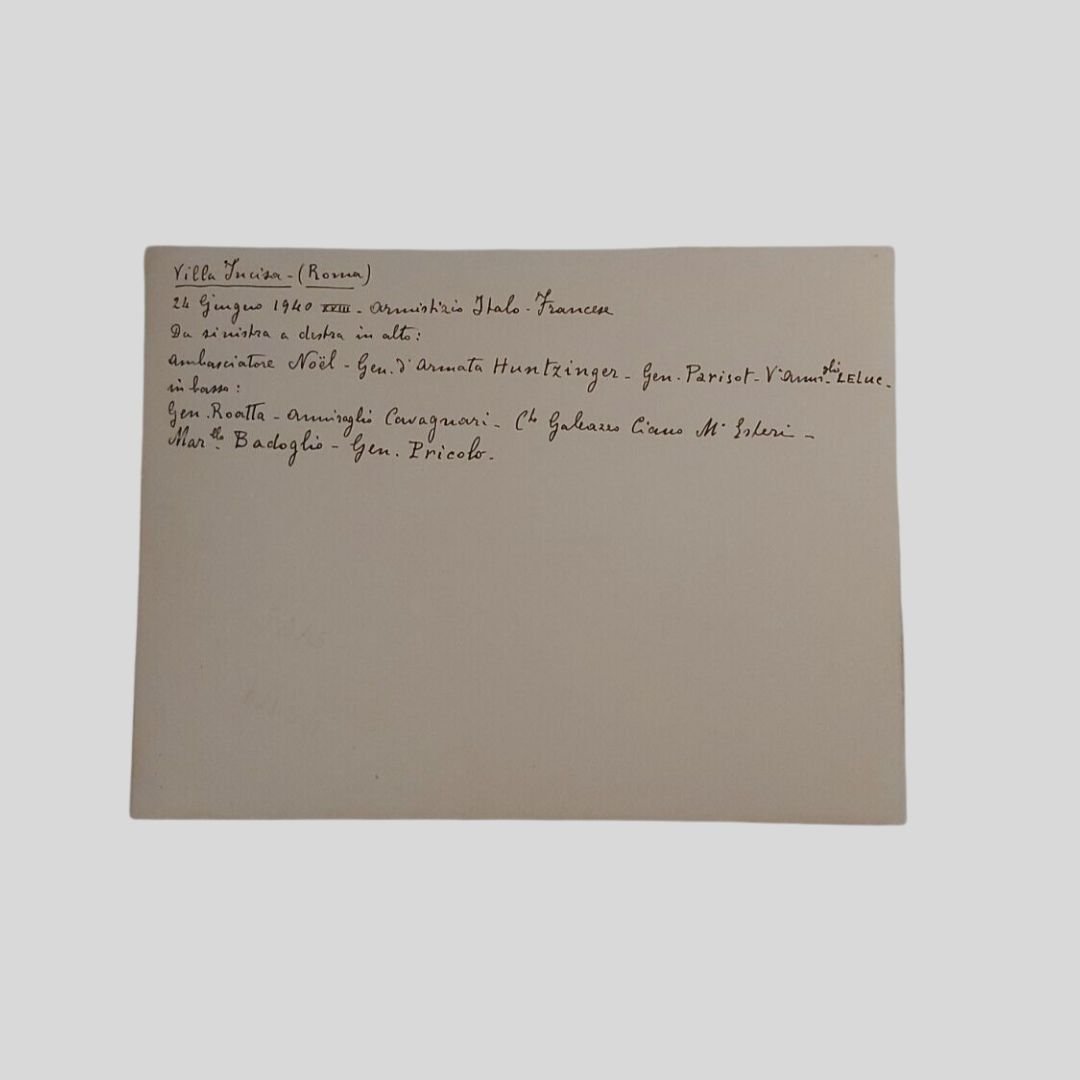 Roma, Villa Incisa, 3 fotografie di grande formato (mm 240×180), Istituto Naz. Luce. Sono presenti, tra gli altri, il Ministro degli Esteri Galeazzo Ciano, il Maresciallo Badoglio, l’Ambasciatore Noel, i Generali Huntzinger, Parisot, Bergeret, Roatta, Pricolo, il Vice Ammiraglio Leluc, l’Ammiraglio Cavagnari. In buone condizioni. Rare.