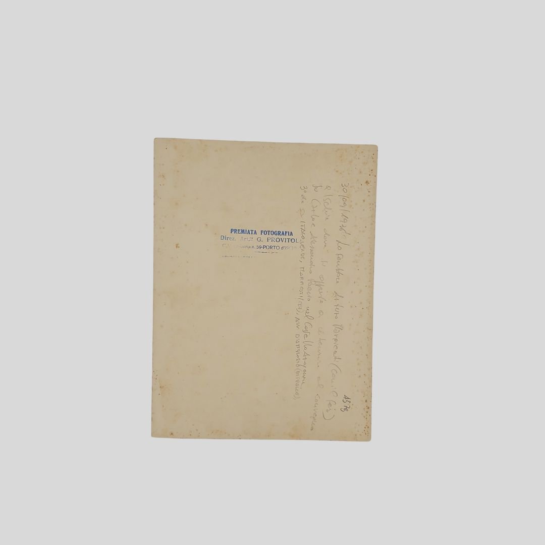 Foto di grande formato (mm 172×232). Timbro a secco al recto e a inchiostro al verso ‘Premiata fotografia G. Provitola – Porto d’Ischia’. Abrasioni e graffi al recto e alcune fioriture al verso. Molto probabilmente il M. si apprestava a partecipare alla commemorazione di Carlo e Alessandro Poerio tenutasi al Castello Aragonese di Ischia il 30 settembre 1936. Non comune.