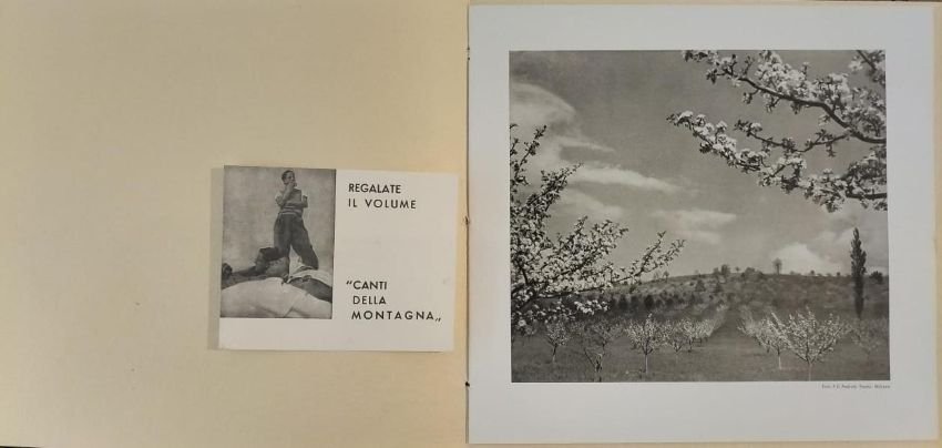 Cartellina rilegata di cm 25x24 contenente 4 stampe fotografiche di cm 18x20 e un cartoncino pubblicitario di cm 12x9 ( "regalate il volume "Canti della montagna"). Il tutto è contenuto in una busta dedicata. Condizioni : USATO - Stato : Buono, ordinari segni d'uso e del tempo. Altre note :