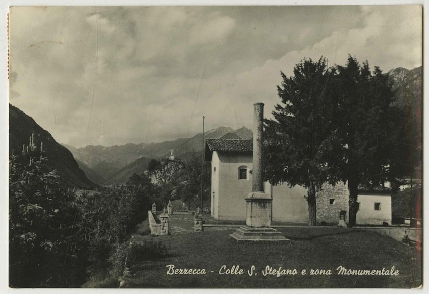 Cartolina postale fotografica alla gelatina di misure 148x102 mm con griglia al verso. Condizioni : USATO - Stato : Buono, ordinari segni d'uso e del tempo. Altre note : Fotografia raffigurante il Colle S. Stefano con la Chiesa di S. Stefano e la zona monumentale. Sulla sommità del Dos Cerì la grande croce bianca eretta dall'Austria. Cartolina viaggiata a Trento con francobollo e timbro dell'ufficio postale di Bezzecca. Al verso note manoscritte.