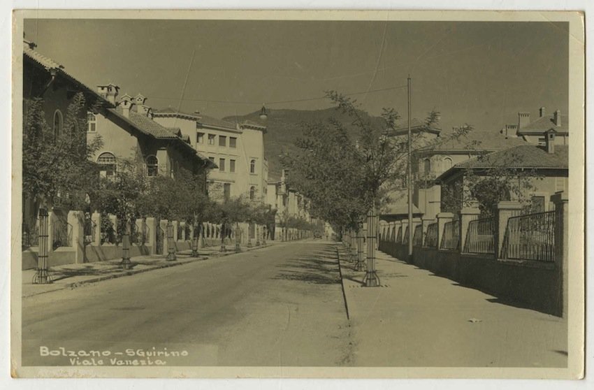 Cartolina postale fotografica alla gelatina di misure 140x91 mm con griglia al verso. Condizioni : USATO - Stato : Buono, ordinari segni d'uso e del tempo. Altre note : Fotografia raffigurante il Viale Venezia di Bolzano costeggiato da villette. Al verso timbro del fotografo.