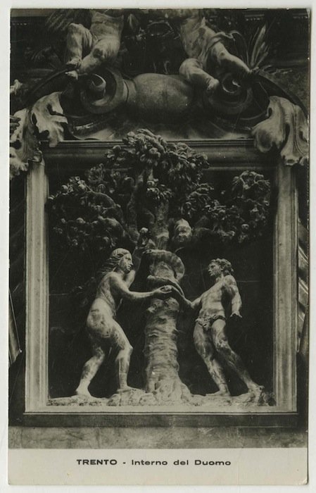 Cartolina postale fotografica di misura 140x88mm con griglia al verso. Condizioni : USATO - Stato : Buono. Altre note : La fotografia raffigura l'altorilievo "Adamo ed Eva" di Francesco Barbacovi posto nella Cappella del Santo crocifisso nella Cattedrale di Trento.