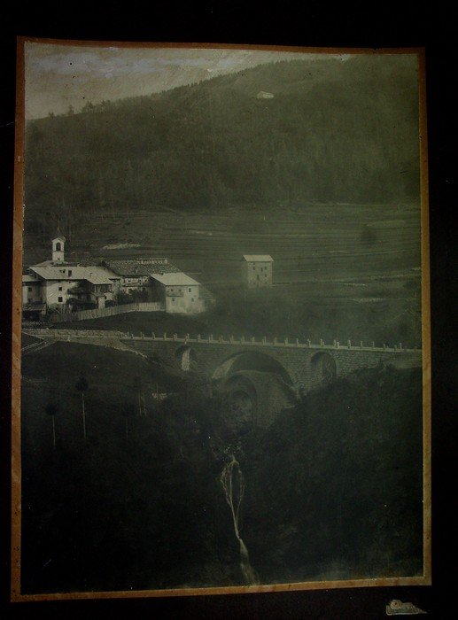 Veduta fotografrica di grande formato, vera stampa fotografica alla gelatina ai sali d'argento di misure 285x390 mm, su cartone di misure 436x550 mm. Condizioni : USATO - Stato : Buono, ordinari segni d'uso e del tempo. Altre note : Al piede etichettina pubblicitaria del fotografo parialmente rimossa. Questo particolare ponte a tre archi, che si trova subito dopo Maso Mattè, è costituito, come dice il nome, da tre archi sovrapposti e indipendenti sul Rio Molina. Il primo dei tre ponti, quello più antico, si trova nella zona più bassa e fu costruito nel 1200 per volontà del conte Tirolo Mainardo II, fondatore della contea del Tirolo. L’arco che si trova al centro invece, fu costruito nel 1862 mentre il terzo, quello sovrapposto agli altri due, è utilizzato tuttora per la viabilità ed è stato costruito nel 1912.