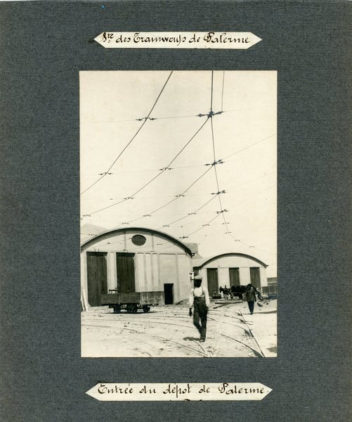 La foto, di dimensioni 12x16, incollata su cartoncino ritrae persone e carrozze che si muovono all'interno del deposito di Palermo.