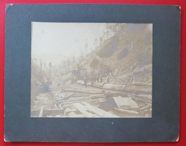 1907. Foto all’albumina applicata su originale cartoncino in color grigio, cm 19 x 24,5. In basso a destra il numero 24. Scorcio di vallone boschivo con alberi tagliati e operai forestali al lavoro, lunga e serena lettera del figlio alla famiglia, datata e firmata al verso del cartoncino “Graz (?) 14 maggio 1904”. Ingiallita l’immagine che altrimenti sarebbe ben conservata.