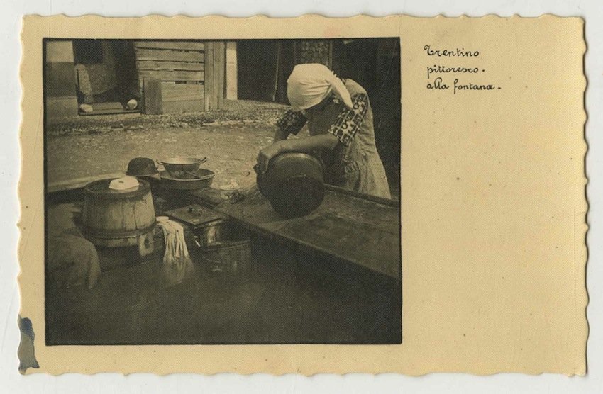 Cartolina postale fotografica di misura 140x90 mm con griglia al verso. Condizioni : USATO - Stato : Buono, ordinari segni d'uso e del tempo e piccola macchia nell'angolo sinistro in basso dell'immagine. Altre note : La fotografia raffigura una signora che lava delle stoviglie alla fontana. Sullo sfondo lo squarcio di una casa. Cartolina viaggiata con timbro dell'ufficio postale di Cles e francobollo. Al verso lunga nota manoscritta.