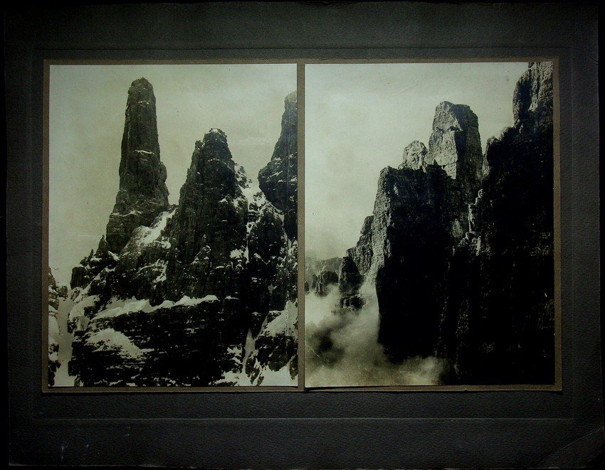 Due vedute stampe fotografiche originali, stampa alla gelatina ai sali d'argento, di misure 17x22 cm applicate su un primo cartone di misure 23x36 cm su un secondo cartone di misure 32x41 cm. Condizioni : USATO - Stato : Buono, ordinari segni d'uso e del tempo. Altre note : Le due vedute delle Dolomiti di Brenta ritraggono il Campanil Basso e il Crozzon di Brenta.