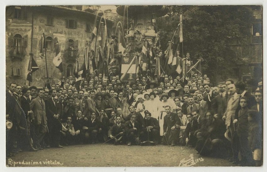 Cartolina postale fotografica alla gelatina ai sali d'argento di misura 138x88 mm con griglia al verso. Condizioni : USATO - Stato : Buono. Altre note : Fotografia di gruppo scattata in piazza Duomo con i fascisti della sezione di Trento in posa con bandiere e stendardi. Al verso timbro dei Fasci italiani di combattimento.