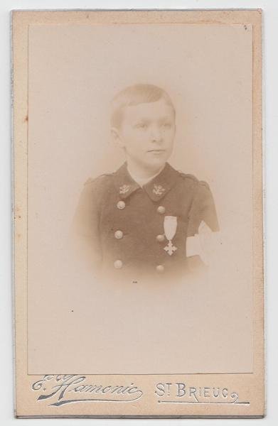 Foto photo bambino in divisa con medaglia e fiocco 1° comunione by E. Hamonic St Brieuc cdv 1870 c.a.