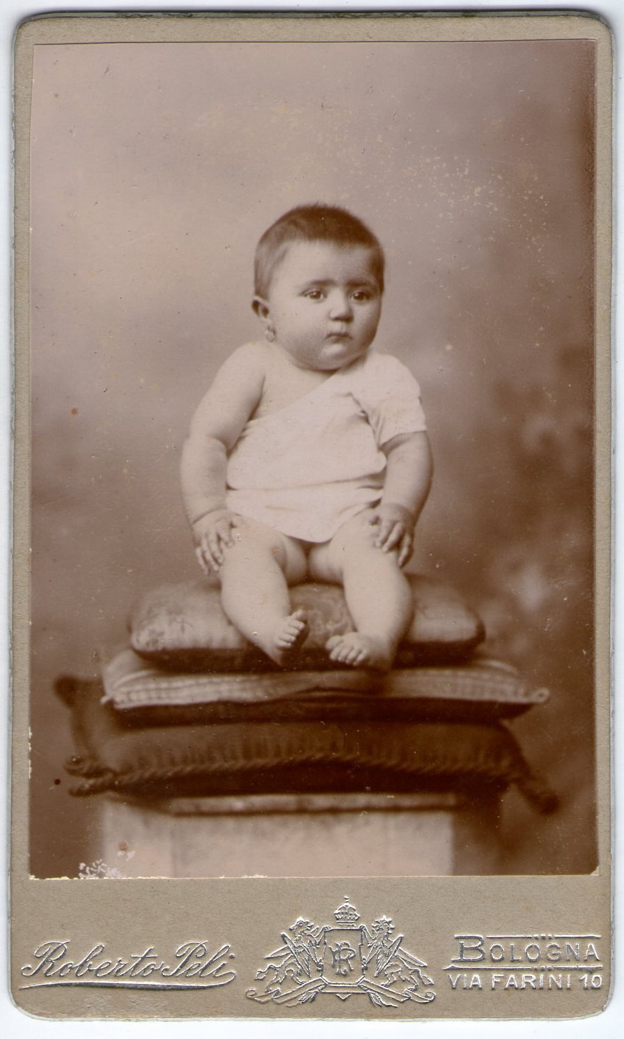 Foto photo bambino seduto sui cuscini by R. Peli Bologna cdv 1880 c.a.