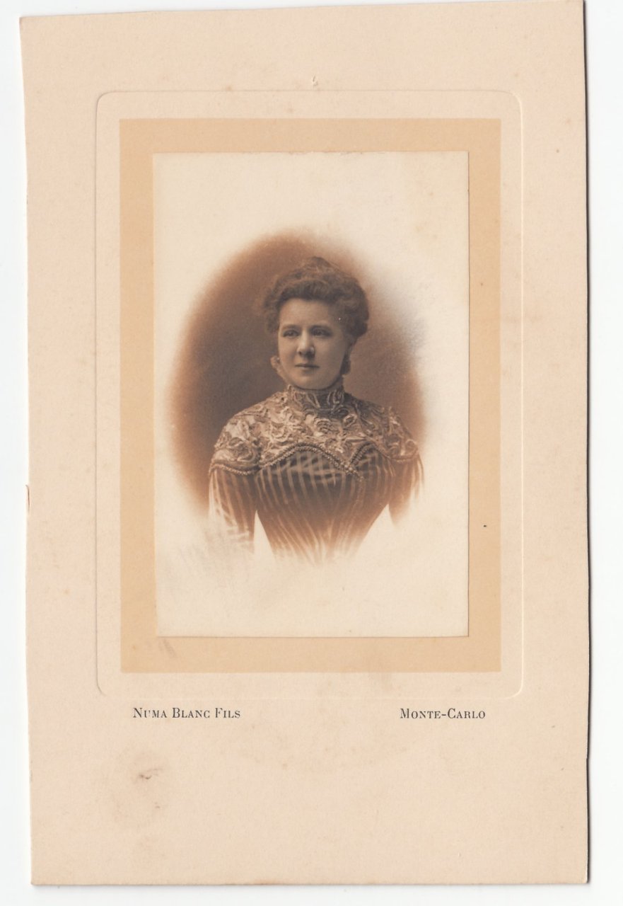 Foto photo cabinet card gentildonna con vestito elegante by Numa Blanc Fils Monte-Carlo 1880 c.a.