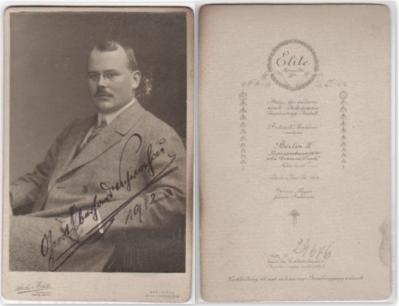 Foto photo cabinet gentiluomo con baffi e occhiali in posa by Atelier Elite Berlin 1912 autografata