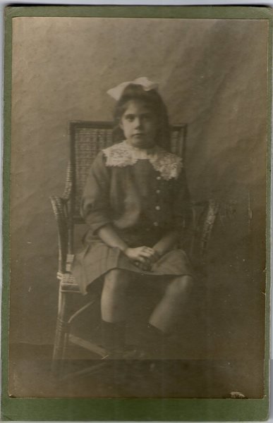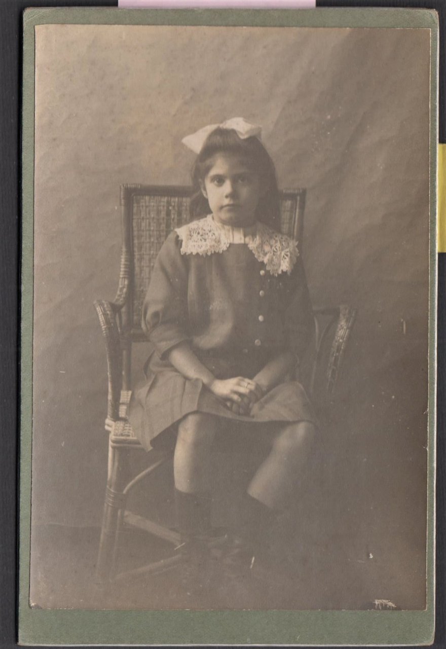 Foto photo cabinet ritratto di bambina seduta con fiocco tra i capelli in posa by Anonimo 1900 c.a.