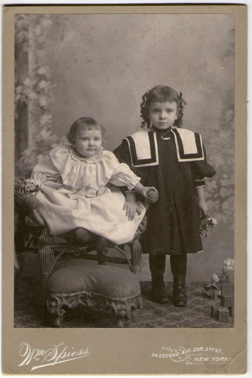Foto photo cabinet ritratto di bambine con giocattoli in posa by Spiess New York 1880 c.a.