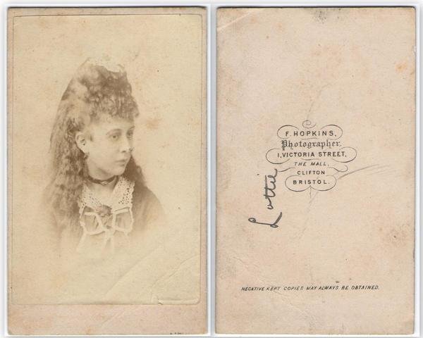 Foto photo gentildonna Lottie con cappello by F. Hopkins Bristol cdv 1880 c.a.