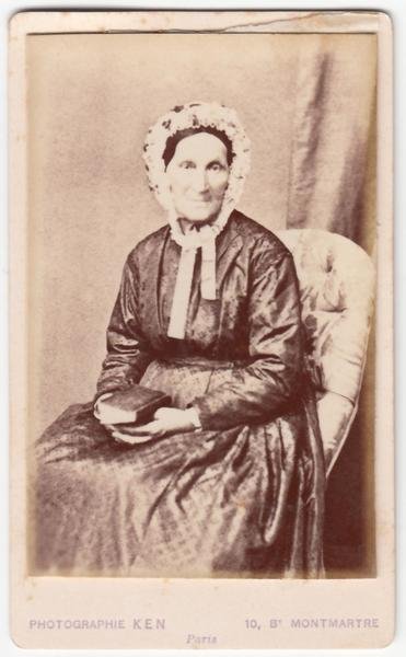 Foto photo gentildonna seduta con libro e cuffia by Phot. Ken Paris cdv 1870 c.a.