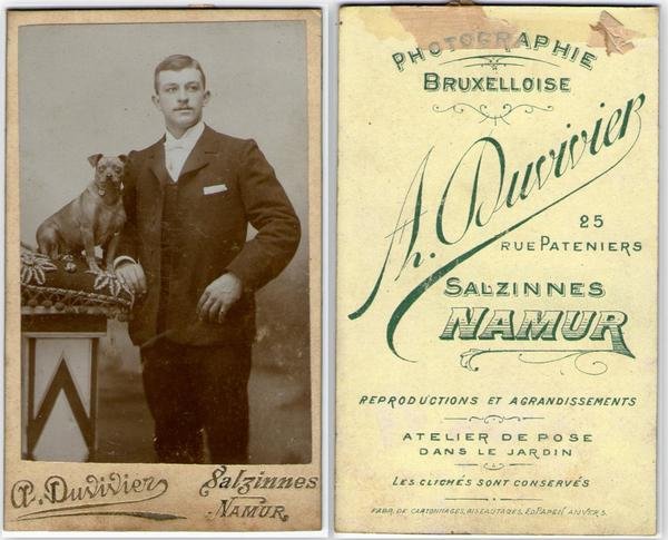 Foto photo gentiluomo accanto ad un cane by A. Duvivier Namur cdv 1880 c.a.
