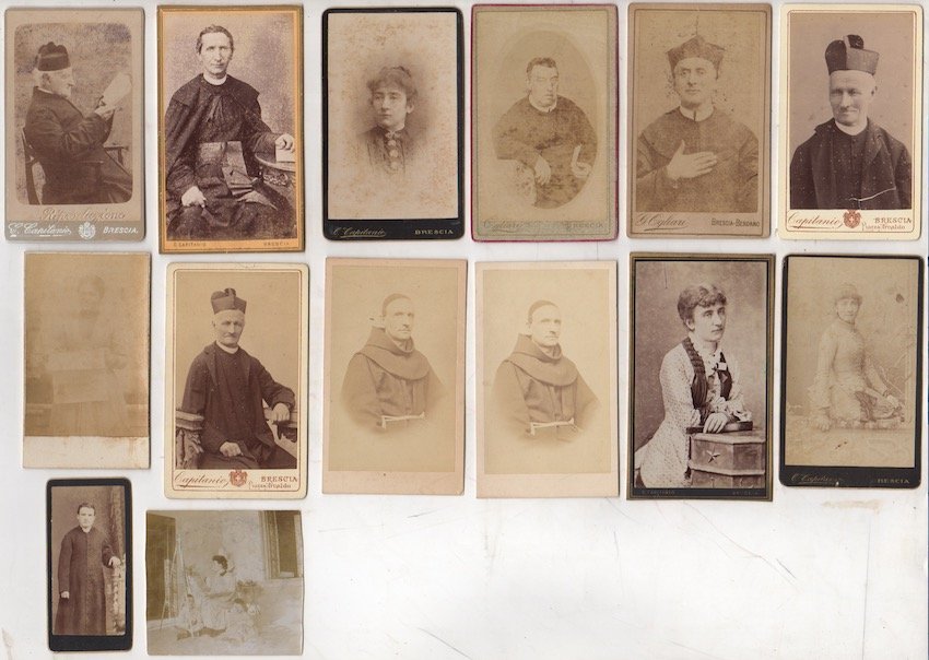 Stampe fotografiche all'albumina di diverse dimensioni montate su cartoncino di misure 101x65mm e cartoncino di misure 78x39 mm. Condizioni : USATO - Stato : Buono, ordinari segni d'uso e del tempo. Altre note : Lotto di 14 foto-ritratti che ritraggono uomini di fede, uomini e donne borghesi, madri con figli. Al verso marchio pubblicitario dei fotografi. IL PREZZO SI RIFERISCE AL LOTTO DI 14 FOTOGRAFIE.