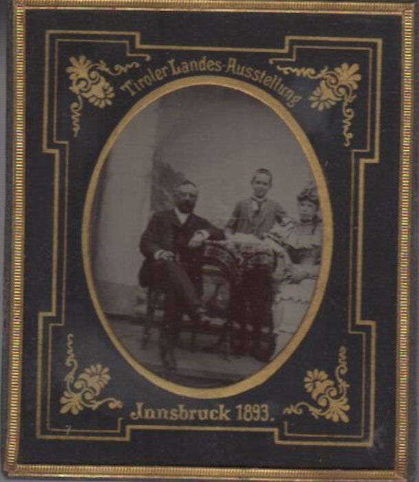 Ambrotipo di misure 7x9 cm entro cornice nera a stampa con foro ovale con i titoli a stampa. Condizioni : USATO - Stato : Buono. Altre note : Al verso manoscritto: Andreas u. Maria di Pauli mit Sohn Leo.