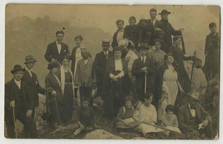 Cartolina postale fotografica alla gelatina ai sali d'argento di misura 137x87 mm. Condizioni : USATO - Stato : Ordinari segni d'uso e del tempo, macchie al verso. Altre note : La fotografia raffigura un gruppo numeroso di persone - uomini, donne e bambini - presso la cima del monte Spitz di Recoaro. Al verso note manoscritte.