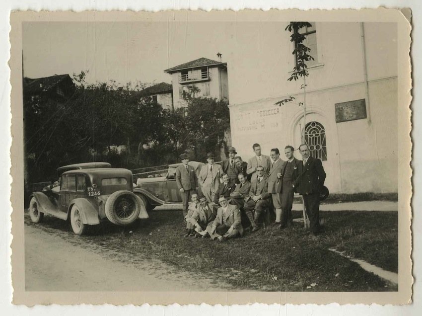 Stampa alla gelatina ai sali d'argento di misure 112x82 mm. Condizioni : USATO - Stato : Buono, ordinari segni d'uso e del tempo. Altre note : Fotografia di gruppo scattata a Bezzecca: alcuni uomini stanno in posa per lo scatto affianco a una automobile con targa TN 1246.