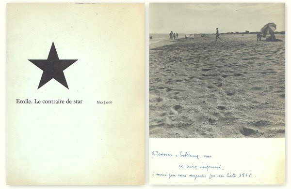 Note: In 8°, depliant di 4 facciate con due massime una di Max Jacob (Etoile. la contraire de star) e Renè Crevel (Le bruit de la mer est il fait de celui de toutes les gouttes d'eau? Mon corps et Moi) e una fotografia b.n. su carta agfa di Franco Vercelotti in formato 23,5X17,5 cm circa con un invio alla base a Franco e Silvana Berutti.