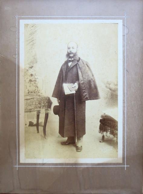 Grande fotografia all'albumina applicata sul suo originale cartone beige, 1880 circa, cm 27 x 39 (la foto) 40 x 52 (il cartone), nell'angolo in basso a destra, in bianco (mal leggibile) c'è la firma del noto fotografo francese "Le Lieure Rome". Henri Le Lieure de l’Aubepin (Nantes 1831 – Roma 1914), nobile francese, fu attivo a Torino come fotografo dal 1861 con la società “Fotografia Parigina”. A Torino, come poi a Roma, Le Lieure divenne celebre come ritrattista dell’alta borghesia, dell’aristocrazia e del mondo culturale. La foto ritrae un uomo in elegante abito cittadino all'interno di un salotto, basette lunghe, alla moda dell'epoca, un mantello, un cappello, un libro e un bastone da passaggio nelle mani. Piccole fioriture sulla fotografia, cartone con visibili ma leggeri aloni (più visibili al margine laterale sinistro fino all'angolo in basso), nell'insieme buono lo stato di conservazione.