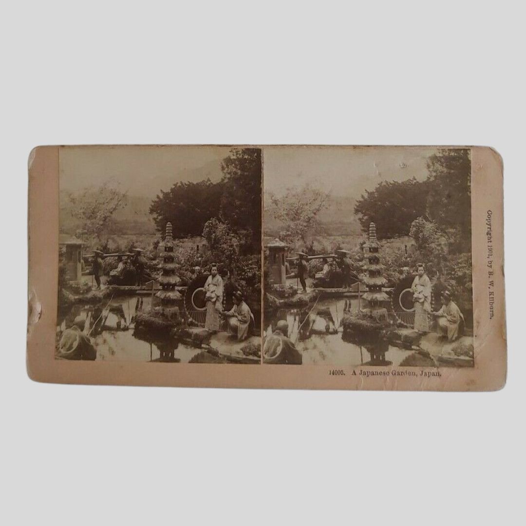 cm 18×9. Stereoscopia all’ambumina, montata su cartoncino. Tracce d’uso agli angoli e alle foto, piccola incrinatura al margine esterno del cartoncino. Geishe in un giardino giapponese con pagoda e palanchino.