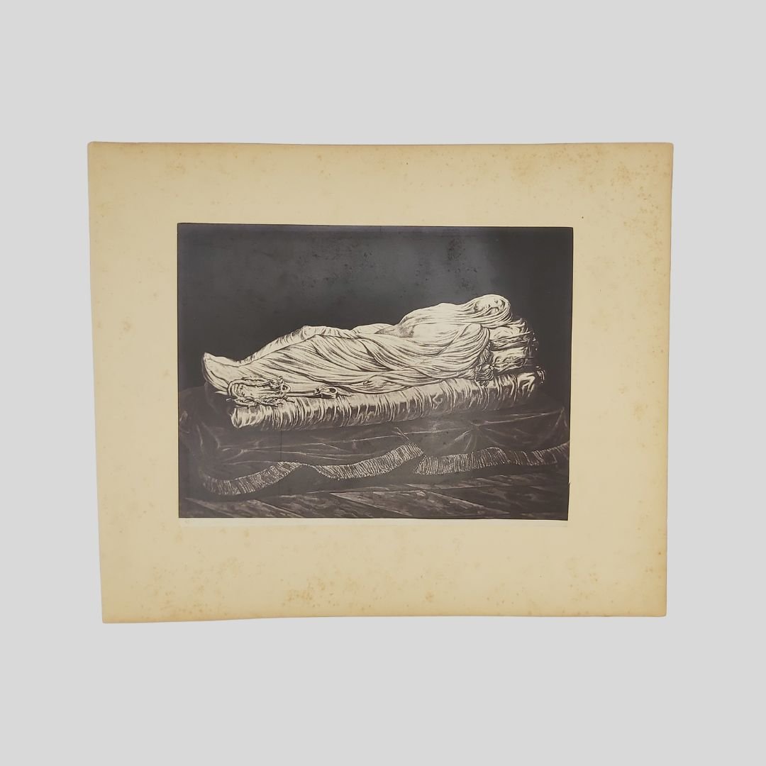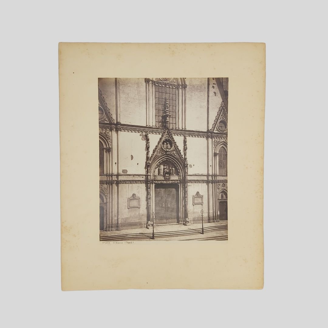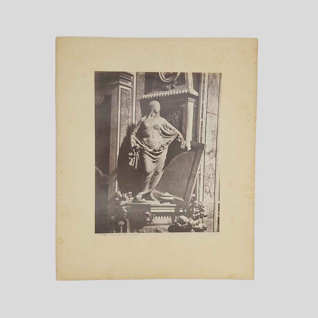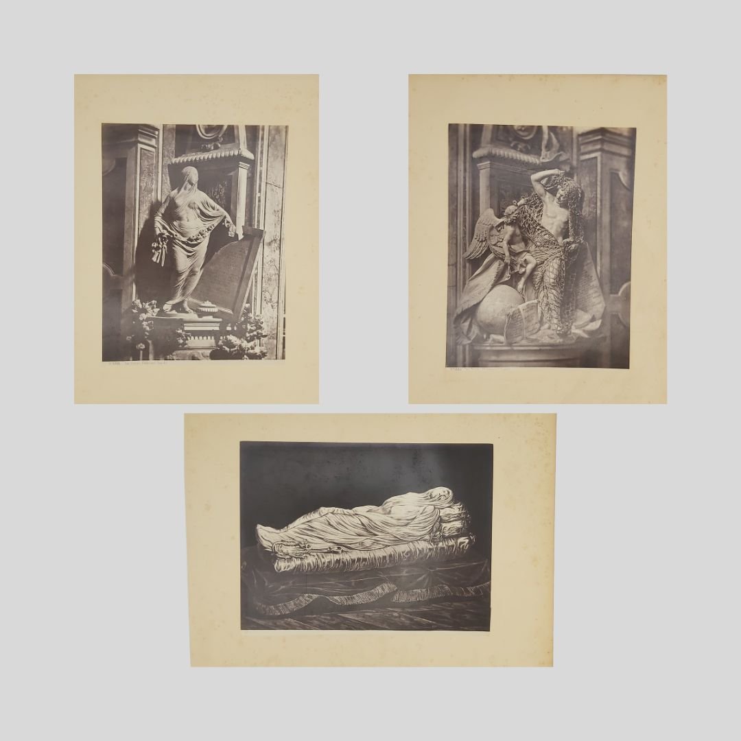 Quattro albumine, di dimensioni variabili [da cm 18,2×23,6 a cm 18,2×24,1] applicate su recto e verso di un unico cartone di supporto di cm 28,7×34,5. S.d. (1880 ca.). Naturali fioriture ai margini bianchi delle pagine. Fotografie in buono stato. Attribuibili a Giorgio Sommer. Molto rare. Con didascalia fotografica lungo il margine inferiore (nel negativo): «N. 6135. San Severo – Disinganno (Napoli)» e «N. 6133. San Severo – Cristo Velato» (didascalia parzialmente sbiadita). Fotografia d’incisione dell’opera di Giuseppe Sanmartino. «N. 6134. San Severo – Pudicizia (Napoli)». e «N. 6119. Il Duomo (Napoli)».