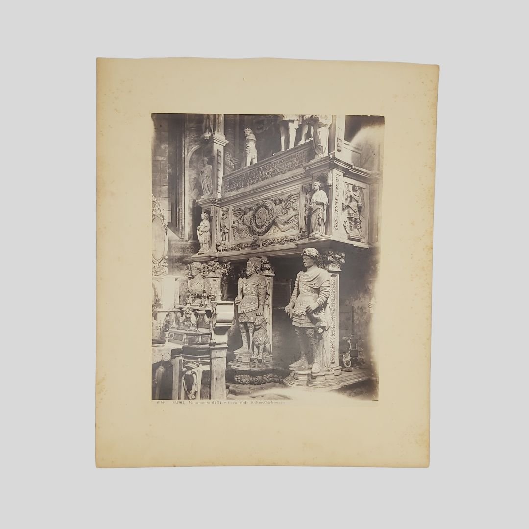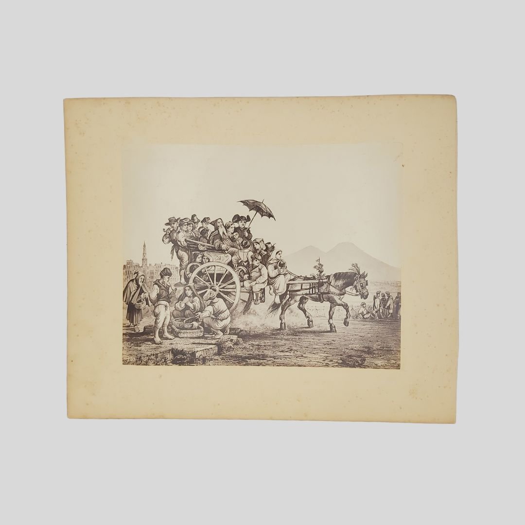 Due albumine, cm 19,7×25 e cm 24,9×19,9 applicate su recto e verso di un unico cartone di supporto, cm 28,7×34,7. S.d. (1880 ca.). Naturali fioriture ai margini bianchi del supporto. Fotografie in buono stato. Attribuibili a Giorgio Sommer. Non comune. Con didascalia fotografica lungo il margine inferiore (nel negativo): «N. 6174 Napoli, Monumento di Giov. Caracciolo. S. Giov. Carbonara». N. «1143», Fotografia d’incisione non firmata raffigurante il «Calesse di Resina» (Consalvo Carelli?).