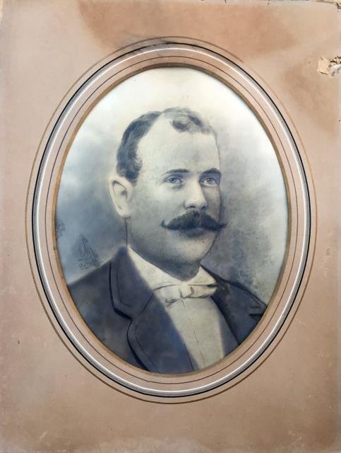 Fotografia in b/n di grande formato inserita in passepartout ovale più volte filettato in bianco, nero e oro, 1890 circa, cm 33 x 43 (l'ovale), cm 49 x 64 (al cartone), stampata su una sorta di spessa carta velina patinata, con ritocchi e finiture manuali. Ritrae un giovane ed elegante uomo con baffi. Difetti marginali del cartone, buono lo stato di conservazione della foto. Al retro, su carta coeva, si legge: "Milano, Corso Garibaldi, 45. Specialità assoluta della Ditta. Ingrandimento Fotografico Inalterabile. Da qualunque fotografia anche vecchia o sbiadita si può ottenere un buon ingrandimento fotografico. Si conservano le negative. Ingrandimento N. 22707".