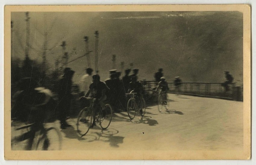 Cartolina postale fotografica di misura 135x83 mm con griglia al verso. Condizioni : USATO - Stato : Buono, ordinari segni d'uso e del tempo. Altre note : Fotografia scattata durante il Giro della Bolghera nel 1938. Nell'immagine sono ritratti i ciclisti durante la gara.