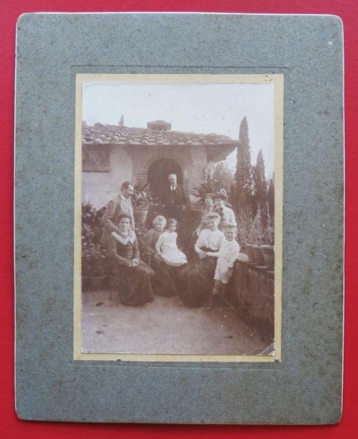 1900 circa. Foto all’albumina, cm 12 x 17 circa, applicata su originale cartoncino editoriale. La foto ritrae un gruppo familiare in uno scorcio di terrazza con alle spalle la bella campagna toscana. Discretamente conservata. .