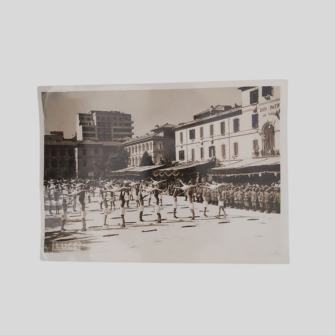 Foto originale virata in seppia (mm 180×130). Roma, Istituto Nazionale Luce, 1939. Lievi Tracce d’uso agli angoli, ma in buone condizioni. Non comune. Al verso didascalia: «Roma 5 luglio 1939-XVII°. La festa della R. Guardia di Finanza – Saggio ginnico alla presenza di S.E. il Ministro Thaon di Revel». Paolo Ignazio Maria Thaon di Revel e di Sant’Andrea [Tolone, 2 maggio 1888 – Poirino, 1º giugno 1973] è stato un politico, dirigente sportivo e schermidore italiano. Nipote del Duca del mare, fu ministro delle Finanze dal 1935 al 1943.
