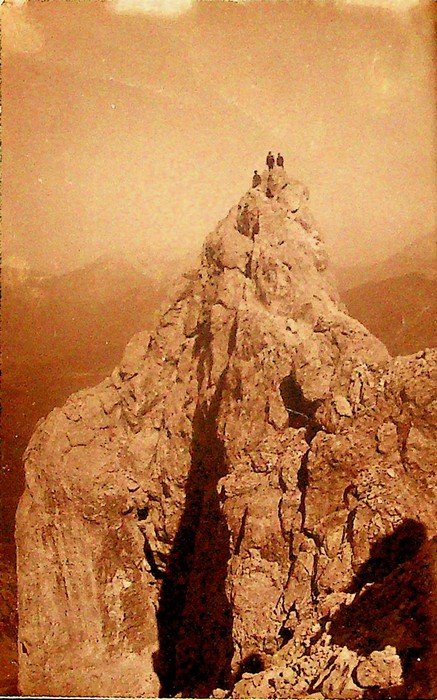 Stampa alla gelatina ai sali d'argento di misure 14x9 cm. Condizioni : USATO - Stato : Buono, ordinari segni d'uso e del tempo. Altre note : Eugenio Dalla Fior nasce a Trento il 12 giugno 1891, secondogenito di una famiglia legata all'ambiente filoitaliano, che caratterizza parte della classe dirigente locale a cavallo fra Ottocento e Novecento. Frequenta l'Imperial Regio Ginnasio di Trento e poi si iscrive alla facoltà di medicina di Torino dove si laurea nel 1916. Allo scoppio della guerra si arruola volontario nell'esercito italiano per prestare servizio negli ospedali militari posti lungo la linea del fronte. Alla fine del conflitto assume la condotta medica di Cles, dove opera generosamente fino al 1951. Per motivi di salute si sposta poi a Riva. Qui muore il 31 dicembre del 1956. La passione per le montagna inizia molto presto, assieme ad un gruppo di amici, che comprende Camillo Marchi, Vittorio Fabbro, Giuseppe Cristofolini, Ettore Grassi, Mite Ghezzer, Lino Vois, Francesco Lot, si avventura sulle Dolomiti di Brenta e di San Martino di Castrozza, fra le rocce della Presanella e i ghiacci dell'Adamello, sulle cime dell'Ortles e del Cevedale, nel Gruppo del Catinaccio e sulla Marmolada, sulle guglie della Valle di Fassa e della Val Gardena. Amico di Guido Rey, per due volte si spingerà anche in Val d'Aosta, per salire le grandi montagne e ammirare la meraviglia del paesaggio alpino.