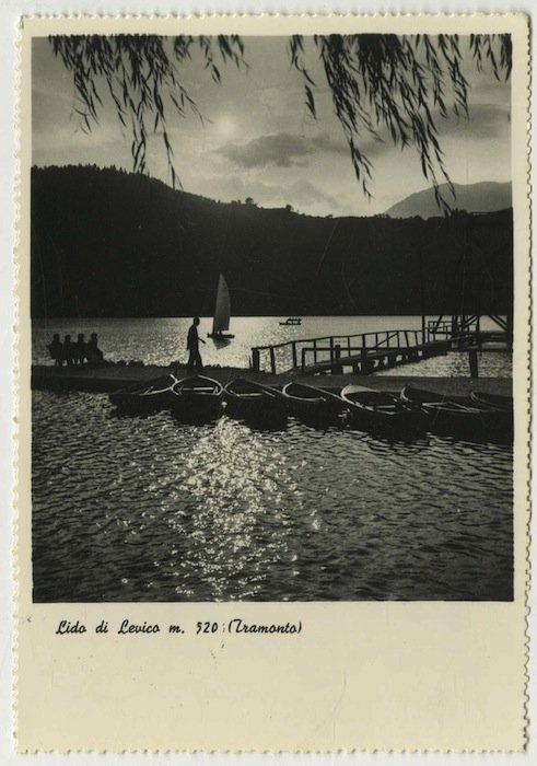 Cartolina postale fotografica alla gelatina di misure 153x101 mm con griglia al verso. Condizioni : USATO - Stato : Buono, ordinari segni d'uso e del tempo. Altre note : Veduta del lago di Levico al tramonto. Cartolina viaggiata a Trento con francobollo e timbro dell'ufficio postale di Levico. Al verso note manoscritte.