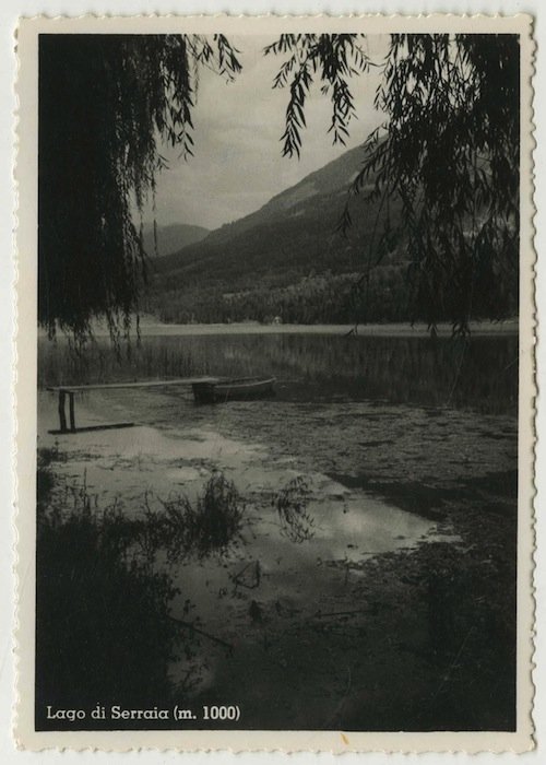 Cartolina postale fotografica di misure 150x106 mm con griglia al verso. Condizioni : USATO - Stato : Buono, ordinari segni d'uso e del tempo. Altre note : Veduta del Lago di Serraia di Baselga di Pinè. Cartolina viaggiata a Trento con quattro francobolli e due timbri dell'ufficio postale di Baselga di Pinè. Al verso note manoscritte.