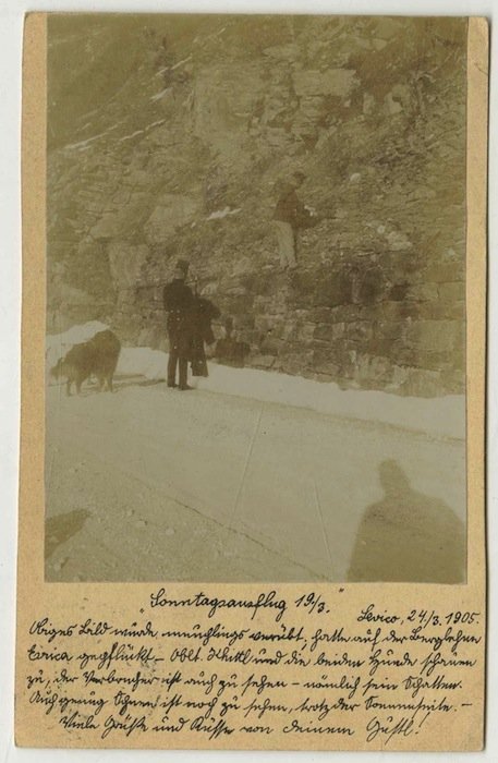 Cartolina postale fotografica di misura 141x89 mm con griglia al verso. Condizioni : USATO - Stato : Buono, ordinari segni d'uso e del tempo. Altre note : La fotografia raffigura due soldati e un cane in una stradina di Levico costeggiata da un'alta parete rocciosa. Cartolina viaggiata con timbro dell'ufficio postale di Zagabria e timbro dell'ufficio postale di Levico. Al recto e al verso note manoscritte.