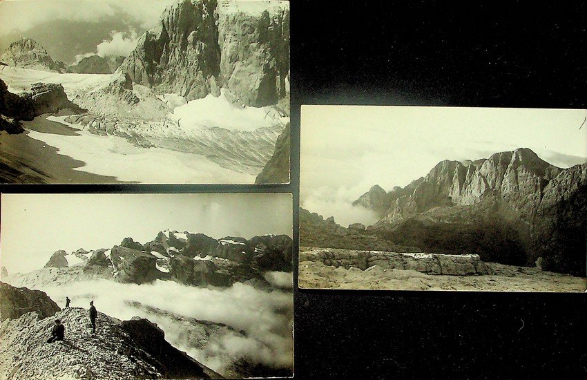 Lotto di 3 stampe alla gelatina ai sali d'argento di misure 14x9 cm. Condizioni : USATO - Stato : Buono, ordinari segni d'uso e del tempo. Altre note : Eugenio Dalla Fior nasce a Trento il 12 giugno 1891, secondogenito di una famiglia legata all'ambiente filoitaliano, che caratterizza parte della classe dirigente locale a cavallo fra Ottocento e Novecento. Frequenta l'Imperial Regio Ginnasio di Trento e poi si iscrive alla facoltà di medicina di Torino dove si laurea nel 1916. Allo scoppio della guerra si arruola volontario nell'esercito italiano per prestare servizio negli ospedali militari posti lungo la linea del fronte. Alla fine del conflitto assume la condotta medica di Cles, dove opera generosamente fino al 1951. Per motivi di salute si sposta poi a Riva. Qui muore il 31 dicembre del 1956. La passione per le montagna inizia molto presto, assieme ad un gruppo di amici, che comprende Camillo Marchi, Vittorio Fabbro, Giuseppe Cristofolini, Ettore Grassi, Mite Ghezzer, Lino Vois, Francesco Lot, si avventura sulle Dolomiti di Brenta e di San Martino di Castrozza, fra le rocce della Presanella e i ghiacci dell'Adamello, sulle cime dell'Ortles e del Cevedale, nel Gruppo del Catinaccio e sulla Marmolada, sulle guglie della Valle di Fassa e della Val Gardena. Amico di Guido Rey, per due volte si spingerà anche in Val d'Aosta, per salire le grandi montagne e ammirare la meraviglia del paesaggio alpino.