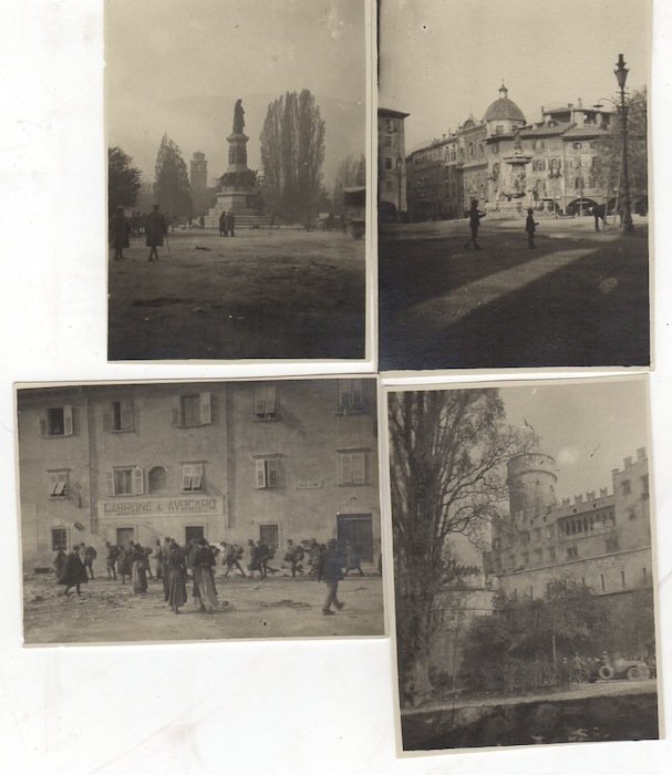 4 stampe alla gelatina sali d'argento di misure 60x80 mm. Condizioni : USATO - Stato : Buono. Altre note : Lotto di 4 fotografie scattate a Trento durante la guerra: sono rappresentati il castello del Buonconsiglio, piazza Dante con il monumento commemorativo, piazza Duomo con la fontana del Nettuno e alcuni prigionieri in fila con gli zaini sulle spalle in piazza d'Armi (oggi piazza Venezia).