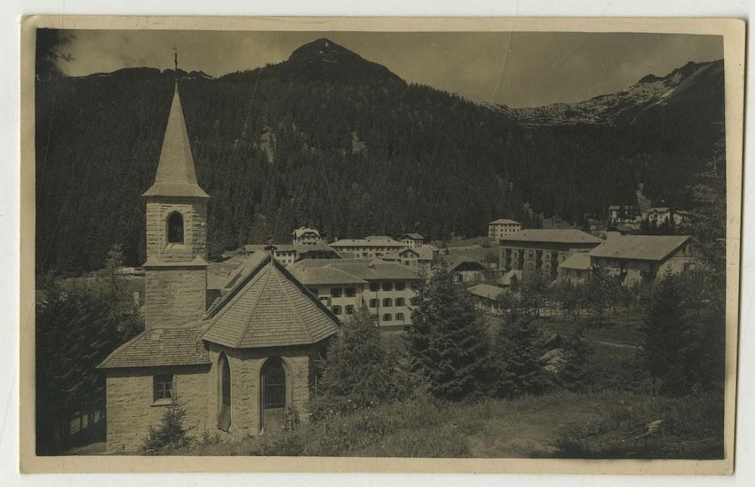 Cartolina postale fotografica di misure 136x87 mm con griglia al verso. Condizioni : USATO - Stato : Buono, ordinari segni d'uso e del tempo. Altre note : Veduta di Madonna di Campiglio, in primo piano il Santuario Beata Vergine Maria dell'Assunta. Cartolina viaggiata a Padova con francobollo e due timbri dell'ufficio postale di Madonna di Campiglio. Al verso note manoscritte.