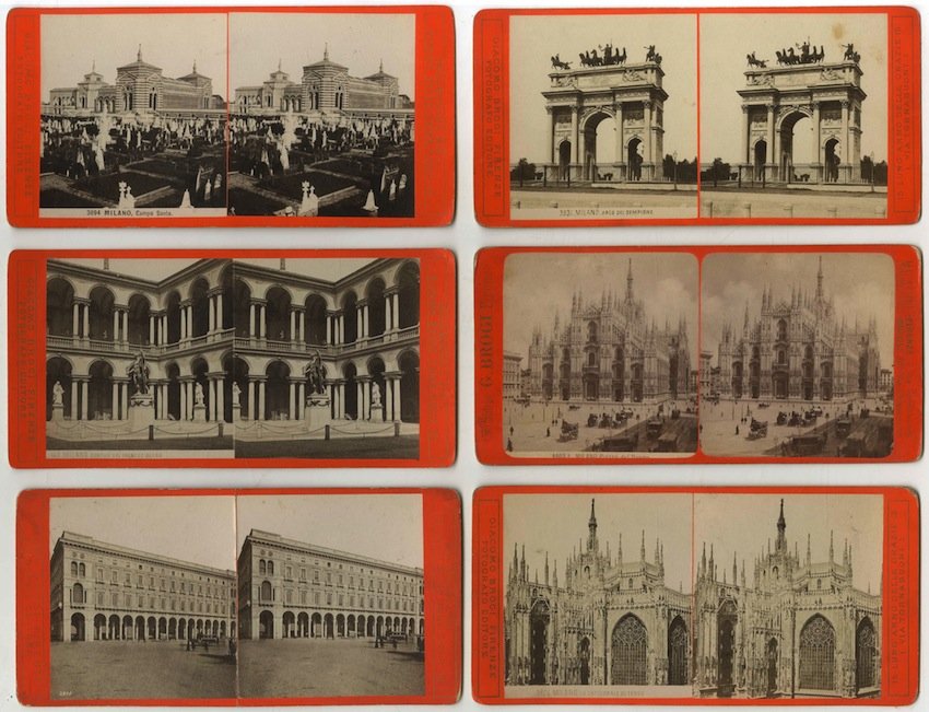 Lotto di 6 stampe fotografiche stereoscopiche di misure 156x82 mm montate su cartoncino di misure 178x83 mm. Condizioni : USATO - Stato : Buono, ordinari segni d'uso e del tempo, alcune macchie. Altre note : Lotto di 6 fotografie che raffigurano Milano: Piazza Duomo, Cattedrale di Santa Maria Nascente, Campo Santo, Arco del Sempione, cortile del Palazzo Brera, portici di Piazza Duomo. IL PREZZO SI RIFERISCE ALLE 6 FOTOGRAFIE ASSIEME.
