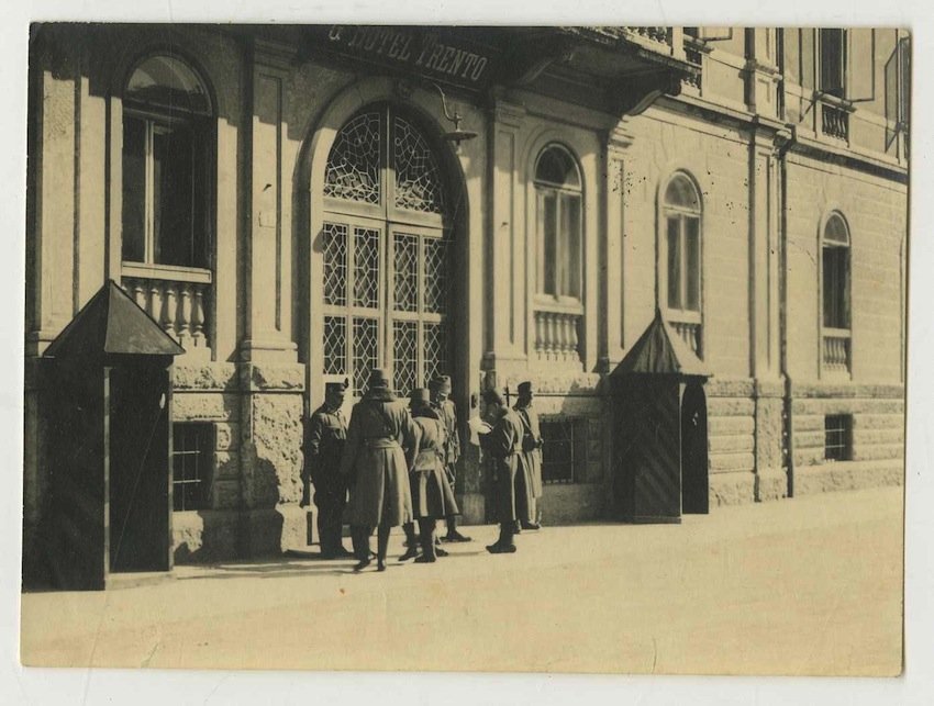 Cartolina postale fotografica alla gelatina ai sali d'argento di misura 107x83 mm. Condizioni : USATO - Stato : Buono. Altre note : La fotografia rappresenta alcuni uomini in divisa davanti al Grand Hotel Trento (attualmente palazzo della Provincia). Al verso è stampato il numero di serie.