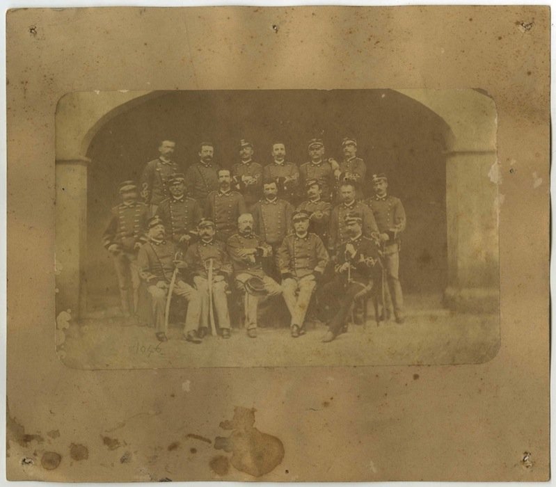 Stampa fotografica all'albumina di misure 205x130 mm montata su cartoncino di misure 250x220 mm. Condizioni : USATO - Stato : Segni d'uso e del tempo, macchie e fori nel cartoncino. Altre note : La fotografia ritrae un gruppo di soldati in uniforme ordinati in tre file. Alcuni tengono in mano una sciabola da artiglieria. Al verso nota manoscritta.