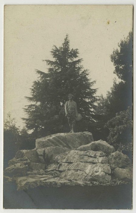 Cartolina postale fotografica alla gelatina ai sali d'argento di misura 139x88 mm con griglia al verso. Condizioni : USATO - Stato : Buono, ordinari segni d'uso e del tempo. Altre note : La fotografia raffigura il monumento a Giovanni Segantini realizzato dall'artista Leonardo Bistolfi.