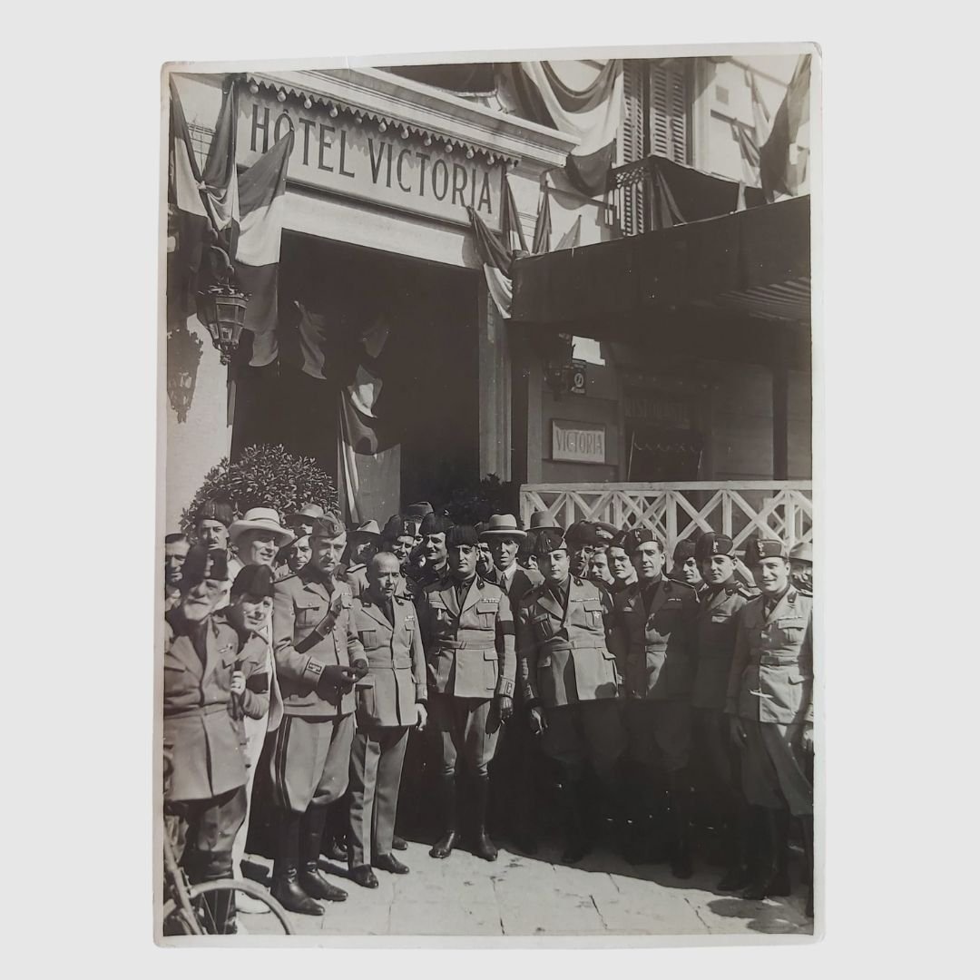 Napoli. Gruppo di fascisti, appartenenti alla Milizia Volontaria per la Sicurezza Nazionale, all’esterno dell’Hotel Victoria.