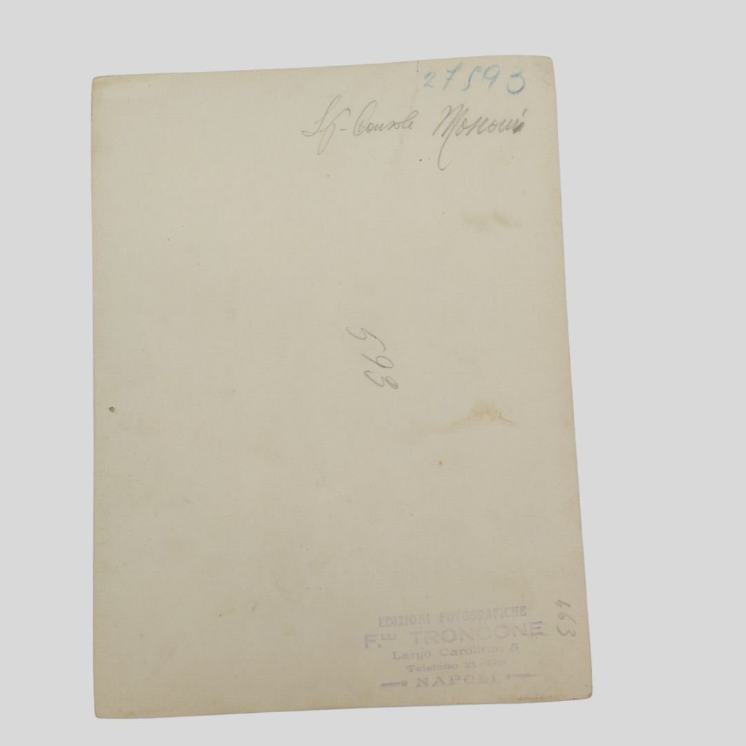 cm 23×17. Fotografia originale di grande formato. Tracce d’uso. Al verso, didascalia a lapis S.E. Console Mozzoni (Adolfo Mozzoni?) e timbro Foto Troncone-Napoli.